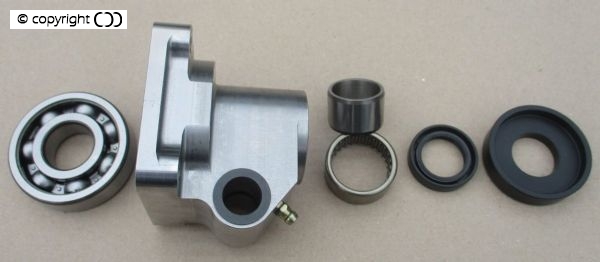 One of the biggest problem of the standard design is the needle roller bearing running directly on the shaft. Under stress and after time the bearing ‘eats into the shaft, develops a clearance and sets up angular forces on the outer ball bearing.