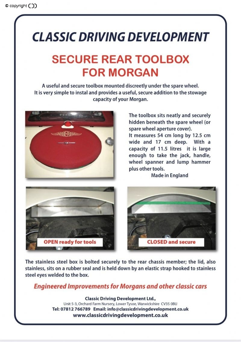 Secure rear toolbox for Morgan: A useful and secure toolbox mounted discreetly under the spare wheel. It is very simple to install and provides a useful, secure addition to the storage capacity of your Morgan.