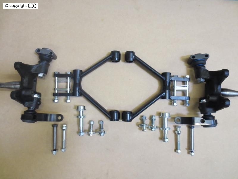 The kit comprises: a pair of ball jointed MGC uprights (customers’ own units), upper wishbone arms, wishbone pivot, bump stops, caster & camber shims, fixings and fitting instructions.