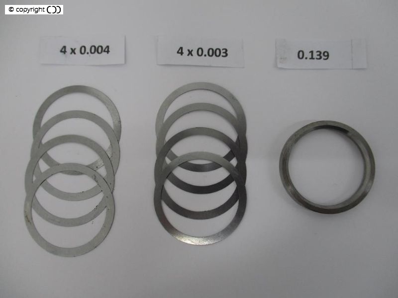 The shim pack contains one shim ring and 4 of the 3 thou and 4 of the 4 thou shims. This is enough to re shim one rear hub.