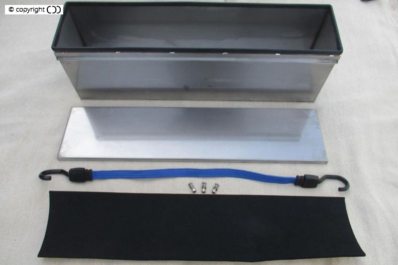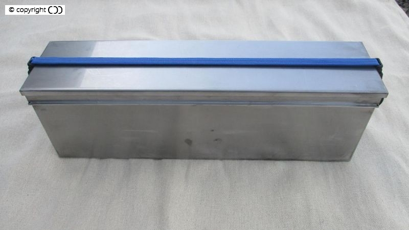 The stainless steel box is bolted securely to the rear chassis member the lid, also stainless, sits on a rubber seal and is held down by an elastic strap hooked to stainless steel eyes welded to the box. Made In England