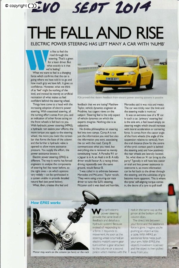 Great driving and handling cars of the past, Porsche 911, Porsche Boxter, Lotus Excel and Lotus Elan M100 all had Hydraulic Power Steering. Lotus use an hydraulic system for the new Evora; Mercedes fit an hydraulic system to the new E class and the SLS and SLS AMG,