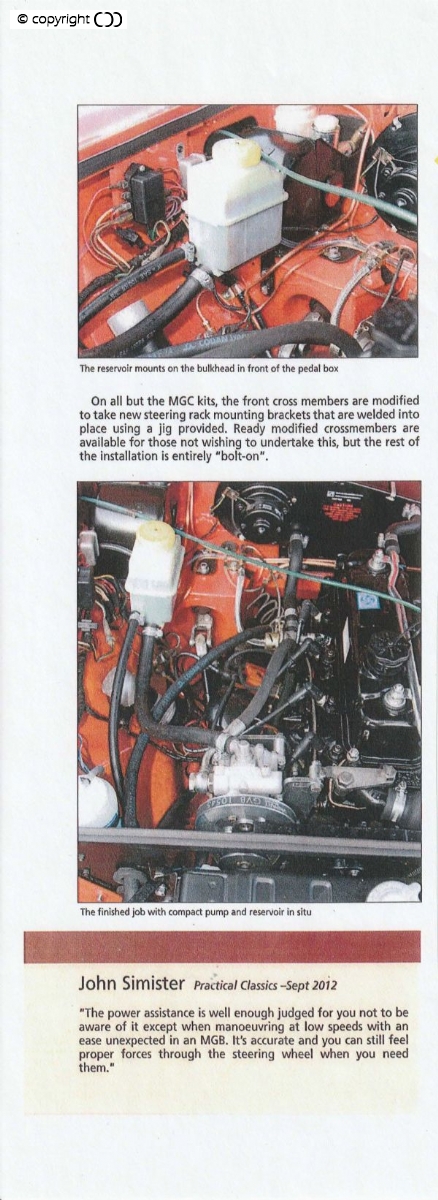 Each kit is designed and engineered for the particular model to reduce effort and stress while enhancing the dynamic response. By using modern components these mechanical-hydraulic systems eliminate unwanted mid-corner steering shocks whilst low speed manoeuvres or parking are made almost effortless. Being mechanical-hydraulic the power steering system gives much better ‘feel’.